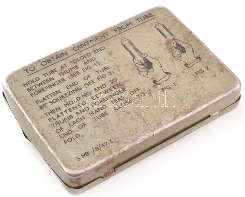 1943 Ointment Anti-Gas No. 3A, mérgező gázok (mustárgáz) elleni bőrkenőcs az amerikai hadsereg katonái számára, fémdoboz, alján használati utasítással, tetején "Tropical Pack" felülnyomással. Kopásnyomokkal, kisebb horpadással, 11x8 cm / U.S. Military anti-gas skin ointment against toxic gases (mustard gas), tin box, with "Tropical Pack" overprint on the top, slightly worn