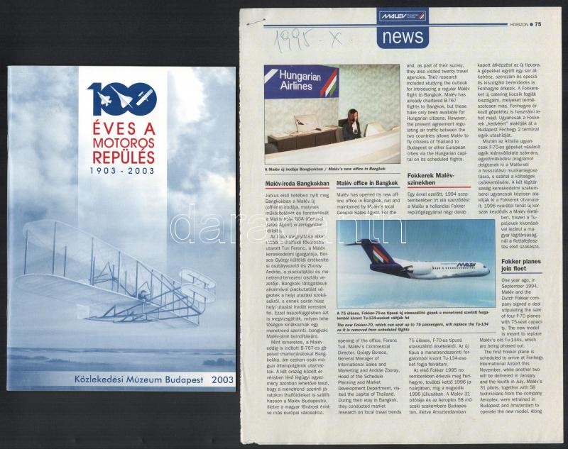 3 db repülés témájú kiadvány: 100 éves a motoros repülés, Ég és föld - Polgári repülés Budapest 18. kerületében, MALÉV újságtöredék