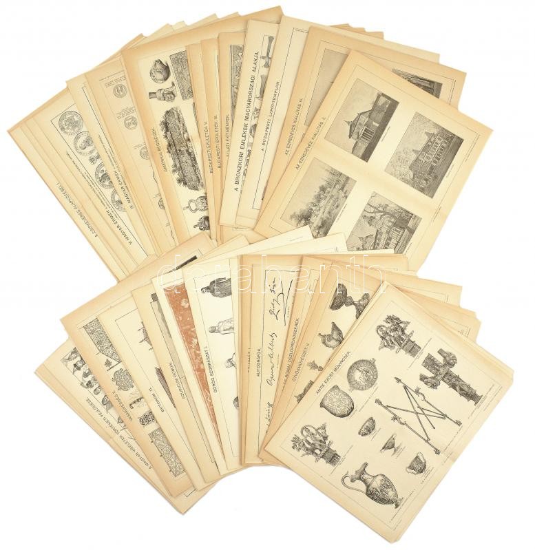 Description: cca 1900 kb. 53 db művészet, régészet, építészet témájú (ötvösművészet, magyar fegyverek, aquincum romjai, budapesti épületek és szobrok stb.) nyomat a Pallas Nagy Lexikonából, 24x30 cm