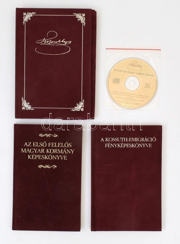 Description: Csorba László: A Kossuth-emigráció fényképeskönyve. Bp.,1994, Kossuth. Fekete-fehér fotókkal illusztrálva. Kiadói bársonykötés, kiadói bársony dísztokban. CD-melléklet: Kossuth Lajos hangja - emlékek, dallamok. + Az első felelős magyar kormány képeskönyve. Bp., 1998, Kossuth. Kiadói bársonykötés.
