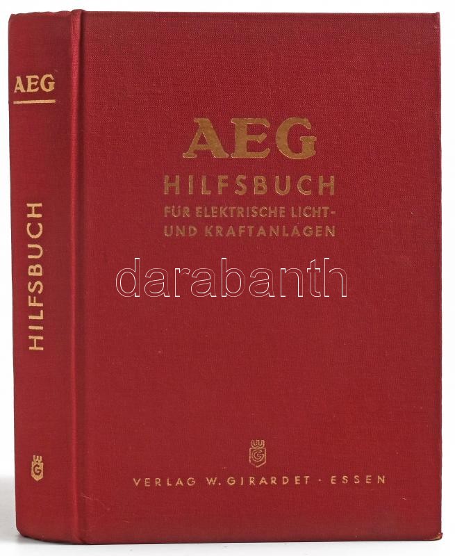 Description: AEG Hilfsbuch für elektrische Licht- und Kraftanlagen. Herausgegeben von der Allgemeinen Elektricitäts-Gesellschaft. Essen, 1953, W. Girardet, 691+(1) p. Fekete-fehér ábrákkal gazdagon illusztrálva. Német nyelven. Kiadói aranyozott egészvászon-kötés.