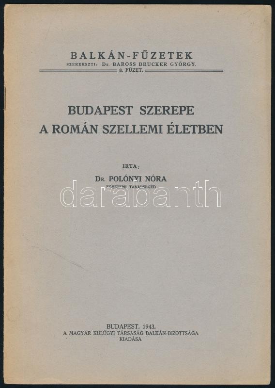 Dr. Polónyi Nóra: Budapest szerepe a román szellemi életben. Bp., 1943, Magyar Külügyi Társaság Balkán-Bizottsága. Kiadói papírkötés, szakadással.
