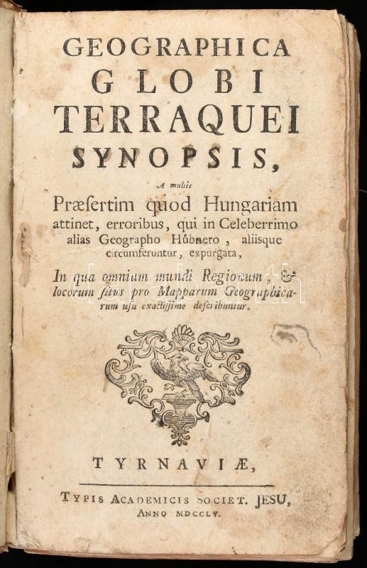 Geographica globi terraquei synopsis, a multis praesertim quod Hungariam attinet, erroribus, qui in celeberrimo alias geographo Hubnero, aliisque circumferuntur, expurgata, in qua omnium mundi regionum, et locorum situs pro Mapparum Geographicarum usu exactissimee describuntur. Tyrnaviae (Nagyszombat), 1755, Typis Academicis Societ. Jesu, (2)+352 p. Latin nyelven. Átkötött kartonált papírkötésben, sérült borítóval, helyenként kissé sérült, foltos lapokkal, több kijáró lappal.