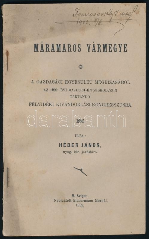 https://www.darabanth.com/en/427-Online-auction/427.0/Books/Books-Travelling-Local-History~1500006/Heder-Janos-Maramaros-varmegye-Maramarossziget-1902-Sichermann-Mor-Kiadoi-tuzott-papi~II2733540
