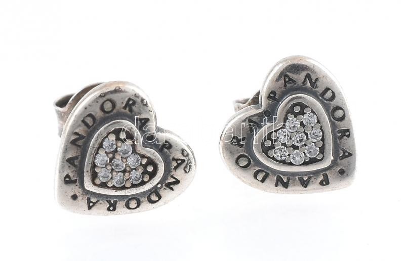 Ezüst(Ag) szívecskés fülbevalópár, Pandora jelzéssel, 1×1 cm, bruttó: 1,5 g