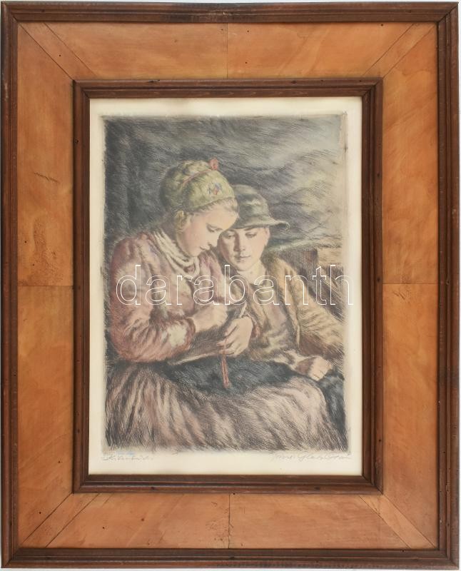 Description: Glatz Oszkár (1872-1958) - Prihoda István (1891-1956): Betűvetés. Színezett rézkarc, papír. Glatz és Prihoda által jelzett. Lap széle kissé sérült. Üvegezett, dekoratív, kissé szúrágta fakeretben. 35x26 cm.