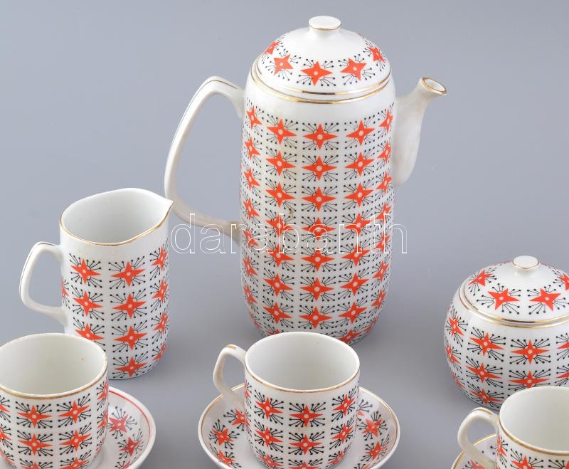 Hollóházi retró hatszemélyes mokkás készlet (kanna, cukortartó, tejszínes kiöntő, 6+1 db csésze, 6 db alj). Matricás, jelzett, kis kopásokkal.