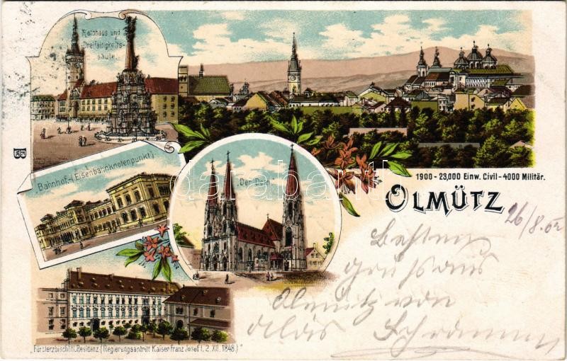 1904 Olomouc, Olmütz; Rathaus und Dreifaltigkeitssäule, Bahnhof, Der Dom, Fürsterzbischöfl. Residenz / town hall, Holy Trinity statue, railway station, cathedral, bishop's residence. Art Nouveau, floral, litho