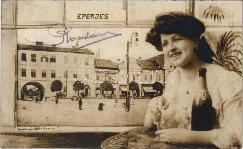 Description: Eperjes, Presov; tér, Cattarino Sándor, Fränkel és Schwarcz üzlete. Goldberger Márk kiadása. Montázs cigarettázó és pezsgőző hölggyel / square, shops. Art Nouveau montage with lady smoking a cigarette and drinking champagne (EK)