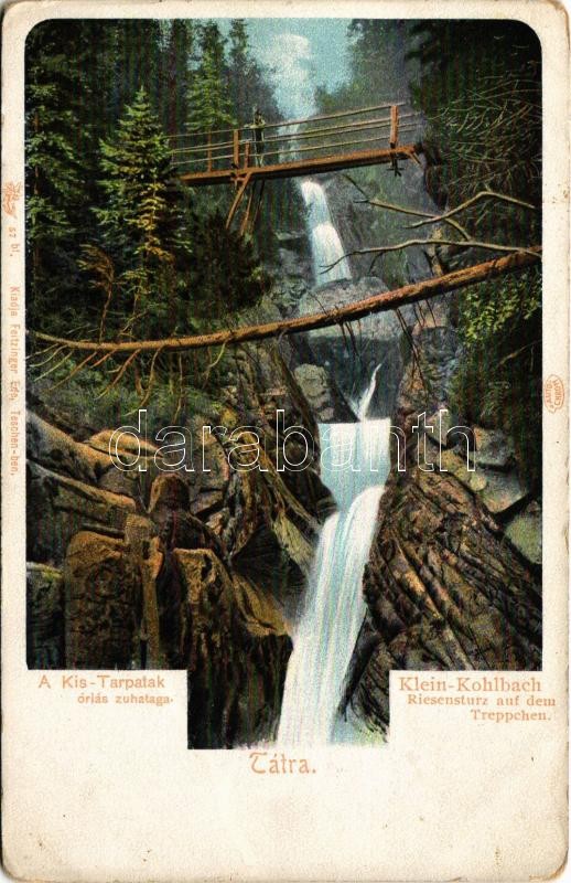Tátra, Magas-Tátra, Vysoké Tatry; Kis-Tarpatak óriás zuhataga. Feitzinger Ede 57bt. Auto-Chrom / Klein-Kohlbach. Riesensturz auf dem Treppchen / waterfall, wooden bridge (EK)