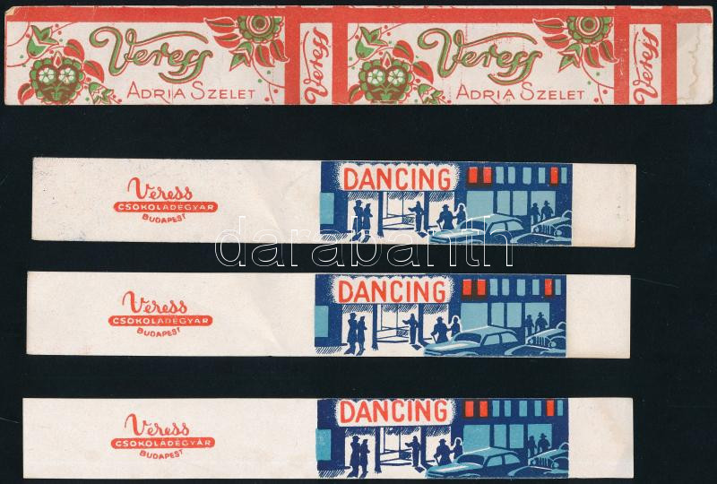 cca 1930-1950 Veress Csokoládégyár Bp., 5 db illusztrált cukorkás, csokoládés csomagolópapír (Adria szelet, Dancing)