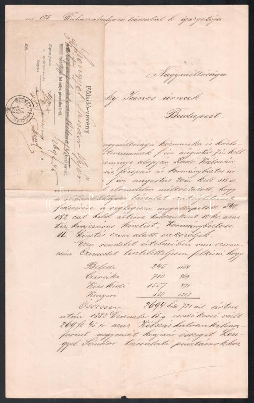 1882 A Rábaszabályozó Társulat ártéri kormánybiztosi kivetéséről szóló értesítő gr. Cziráky Jánosnak főladó vevénnyel