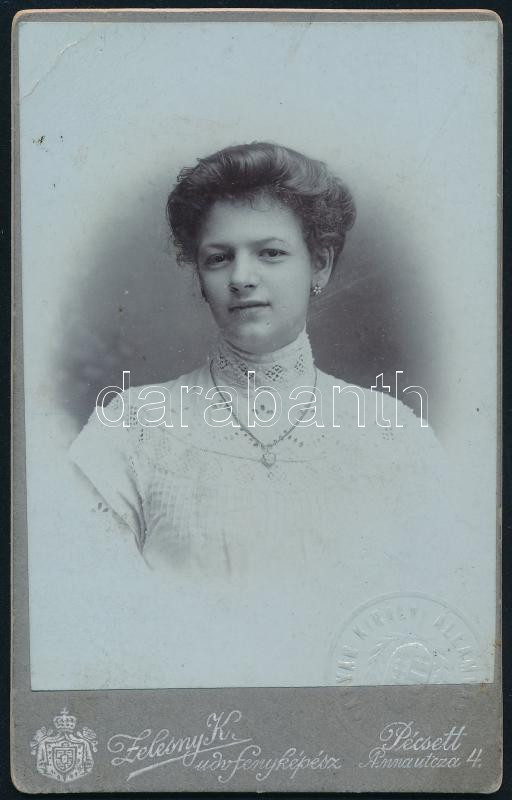 1913 Hölgy keményhátú vizitkártya fotója, Zelesny Károly udvari fényké... https://www.darabanth.com/en/428-Online-auction/428.0/Art-and-other-collectibles/Documents~500018/1913-Holgy-kemenyhatu-vizitkartya-fotoja-Zelesny-Karoly-udvari-fenykepesz-pecsi-mutermC3~II2741418