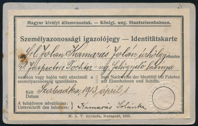 Description: 1913 Hölgy keményhátú vizitkártya fotója, Zelesny Károly udvari fényképész pécsi műterméből, MÁV személyazonossági igazolványként használva, szárazbélyegzővel, 11x6,5 cm