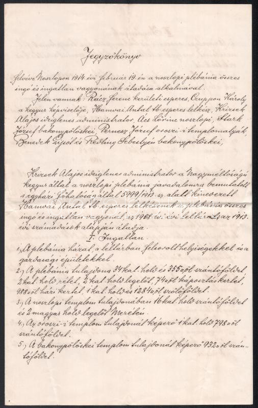 1914 Noszlopi plébánia vagyonának átadási jegyzőkönyve, Hornig Károly ...