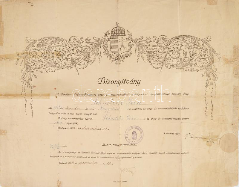 1914 Védőnői oklevél Wlassics belügyminiszter aláírásával 50x40 cm Erő...