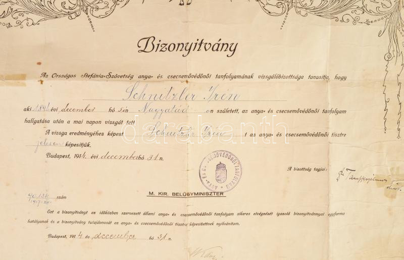https://www.darabanth.com/en/428-Online-auction/428.0/Art-and-other-collectibles/Documents~500018/1914-Vedonoi-oklevel-Wlassics-belugyminiszter-alairasaval-50x40-cm-Erosen-serult~II2736445