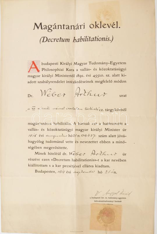 https://www.darabanth.com/en/428-Online-auction/428.0/Art-and-other-collectibles/Documents~500018/1918-Egyetemi-magantanari-oklevel-Weber-Arthur-1888-1929-irodalomtortenesznek-31x48-cm-~II2736444