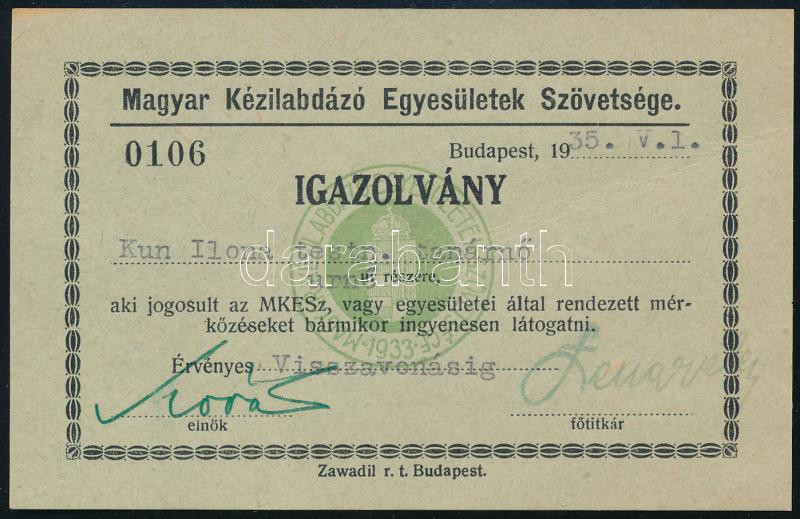 1935 Magyar Kézilabdázó Egyesületek Szövetségének igazolványa