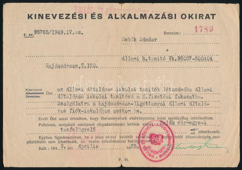 1949 Ortutay Gyula miniszter, tudós által aláírt kinevezési irat