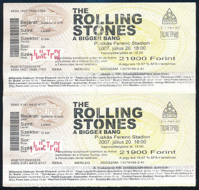2007 Bp., The Rolling Stones - A Bigger Bang, 2 db koncertjegy, Puskás Ferenc Stadion