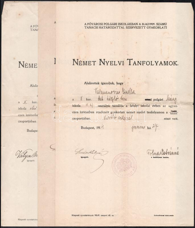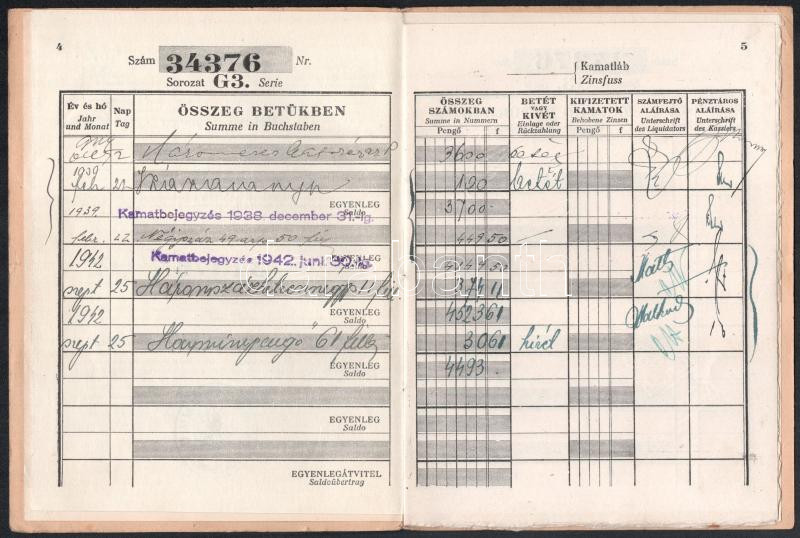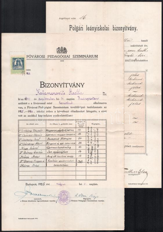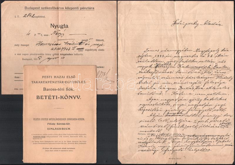 Description: cca 1910-1943 14 db vegyes okmány tétel: bizonyítványok (Kisszállási Uradalom Rt.; X. ker zeneconcervatorium Bp. stb.), betéti könyv, részben kissé foltos és sérült