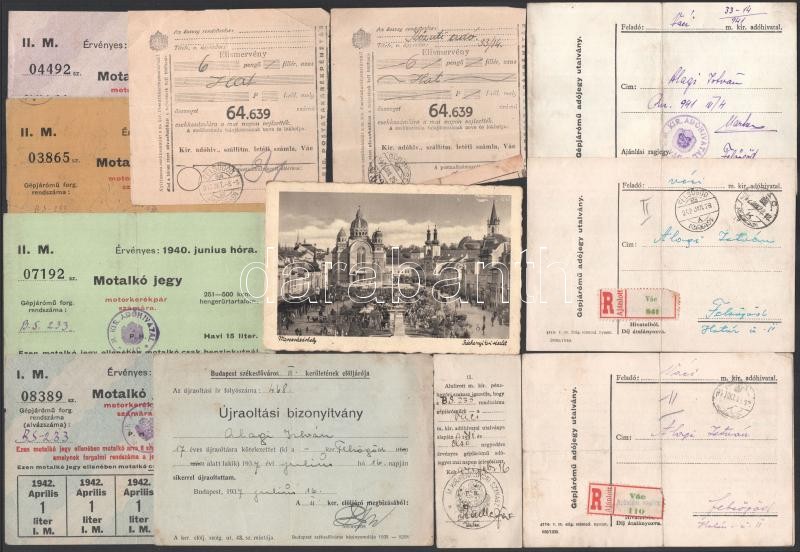 cca 1940 Kis vegyes okmány tétel: Motalkó jegyek, újraoltási bizonyítványok, stb.