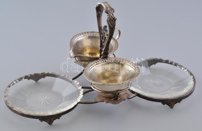 Angol reggeliző, asztalközép, jelzett, üveg tálkával, kis lepattanások, m: 20,5 cm