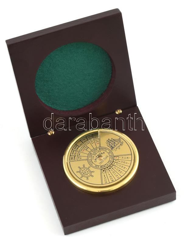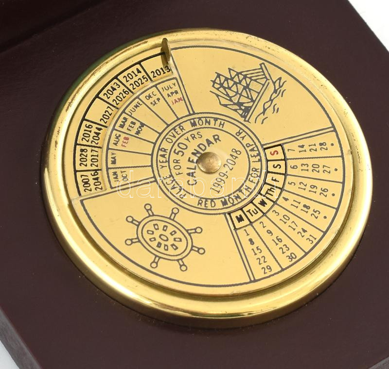 Kalendárium 50 évre (1999-2048), fa tokba rögzítve, jó állapotban, 9×9...