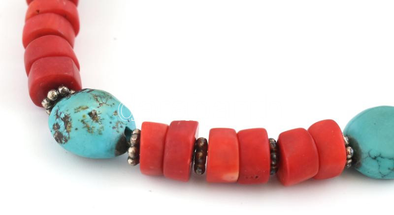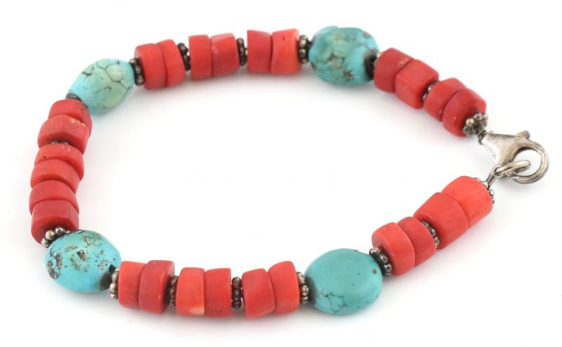 Korall és türkiz karkötő, ezüst (Ag) szerelékkel, h: 20 cm