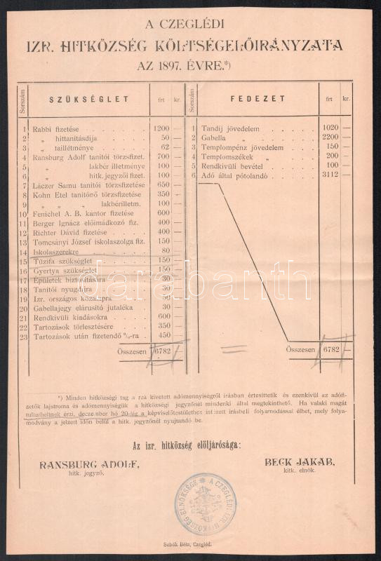 1897 A Czeglédi izr hitközség előirányzata az 1897 évre.
