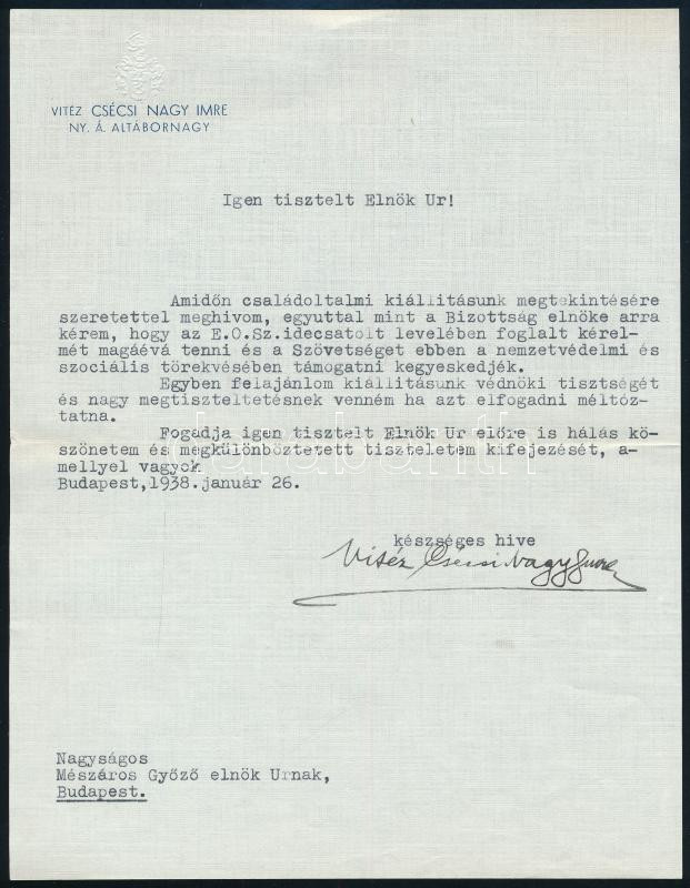 1938 vitéz Csécsi Nagy Imre ny. á. altábornagy aláírt levele fejléces levélpapírján