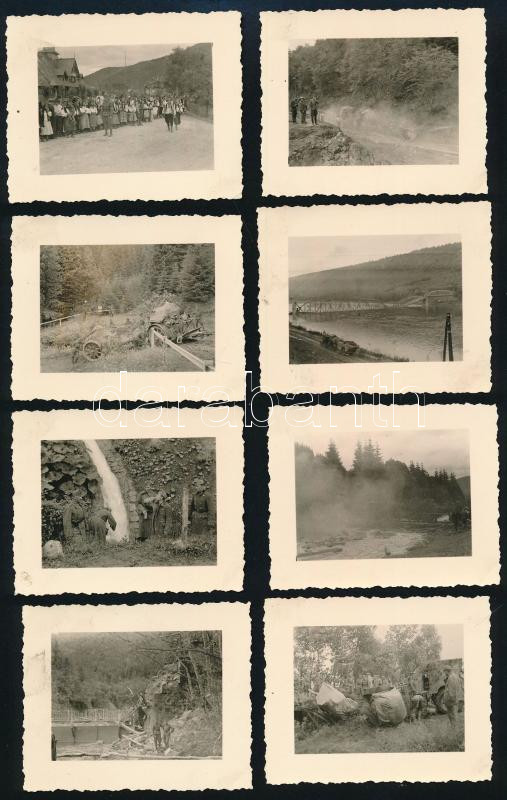 Description: 1941 Magyar csapatok a galíciai Usciesco-nál 1941. augusztusában a Dnyeper partjainál, felborult löveg, felrobbantott híd, díszkapus helybeliek, 11 db fotó hátoldalon feliratozva, 6×7,5 cm