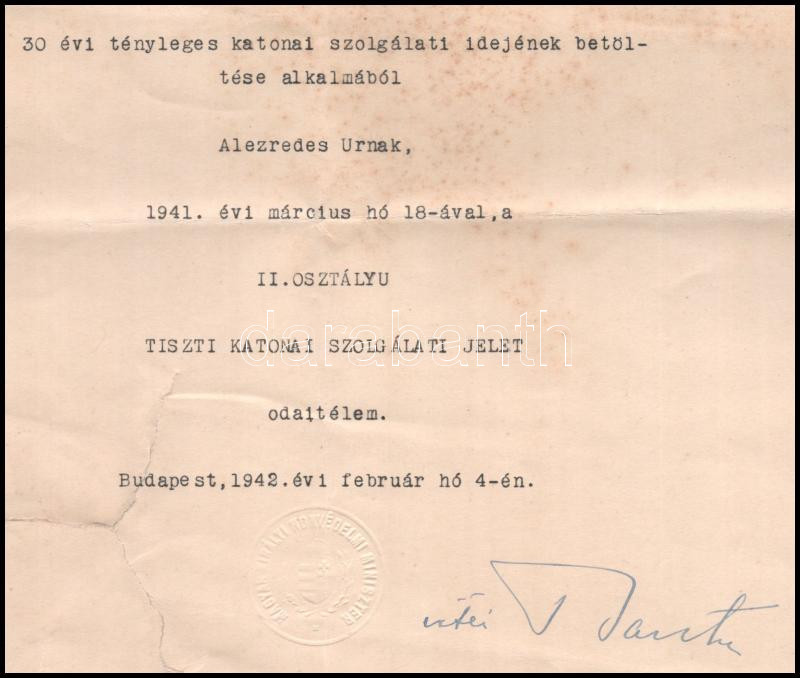 Description: 1942 Vitéz dálnokfalvi Bartha Károly (1884-1964) honvédelmi miniszter autográf aláírása II. osztályú tiszti katonai szolgálati jelet. Szakadással 42 cm
