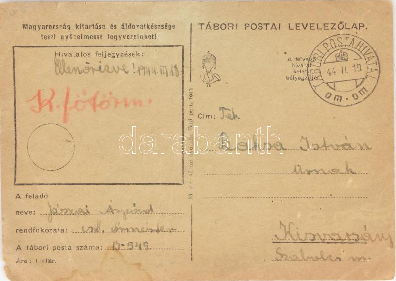 1944 Csendőr őrnagy által küldött tábori postai levelezőlap
