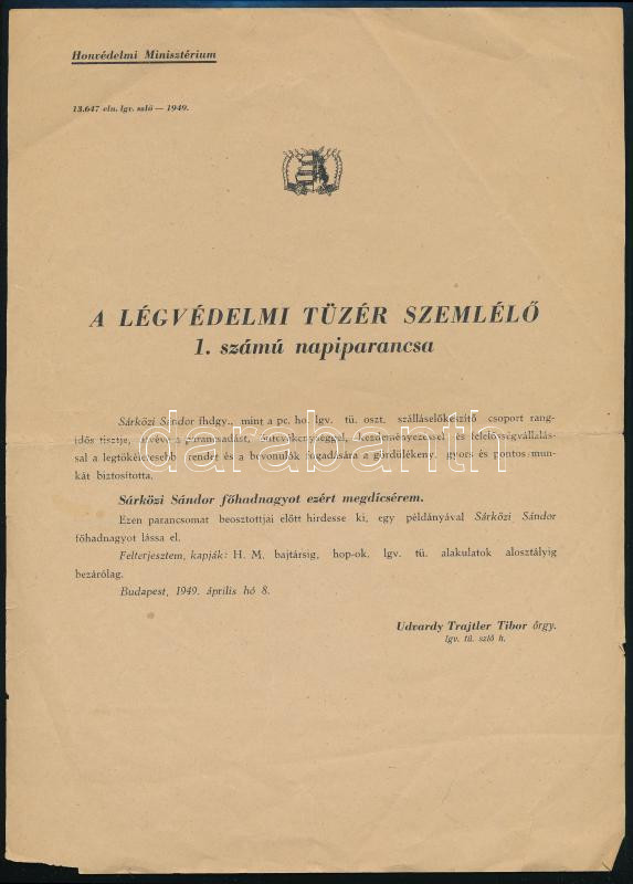 https://www.darabanth.com/en/428-Online-auction/428.0/Art-and-other-collectibles/Military~500028/1949-Bp-A-legvedelmi-tuzer-szemlelo-1-szamu-napiparancsa-a-Honvedelmi-Miniszterium-dic~II2739350