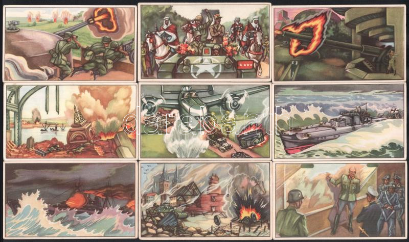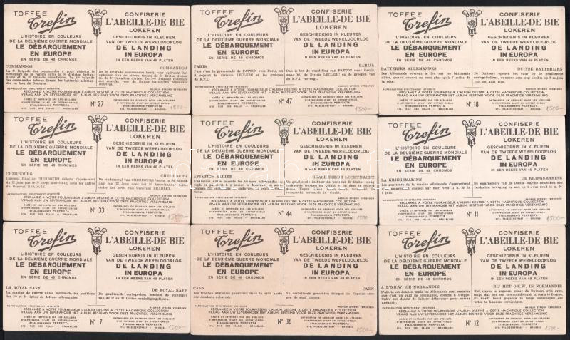 II. világháborús belga gyűjtőkártyák, színes illusztrációkkal, hátoldalán francia és flamand nyelven feliratozott, ofszet, papír, 8,5x14 cm