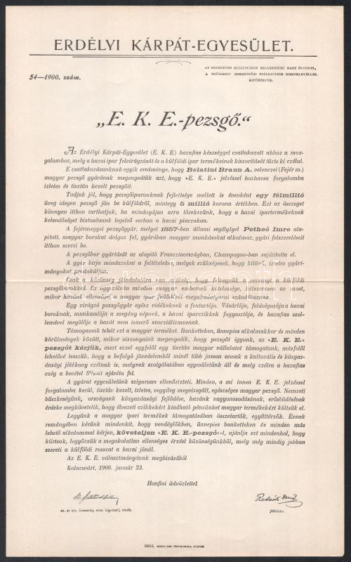 Description: 1900 Kolozsvár, Az Erdélyi Kárpát Egyesület (EKE) körlevele a velencei (Fejér megye) Belatini Braun A. által készített, EKE jelzésű pezsgő forgalomba hozataláról