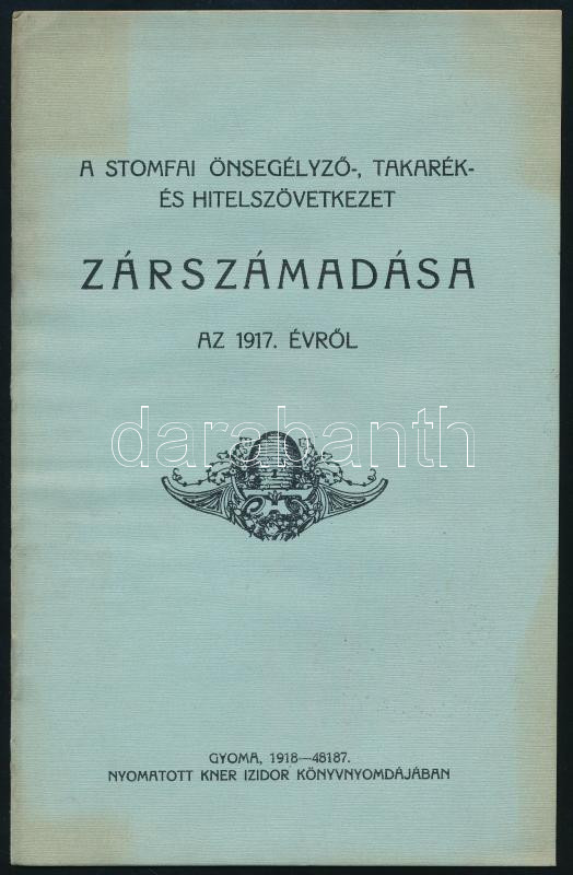 1918 A Stomfai Önsegélyező-, Takarék- és Hitelszövetkezet Zárszámadása... https://www.darabanth.com/en/428-Online-auction/428.0/Art-and-other-collectibles/Printed-Materials~1000004/1918-A-Stomfai-Onsegelyezo-Takarek-es-Hitelszovetkezet-Zarszamadasa-az-1917-evrol-e~II2743556