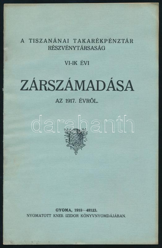 Description: 1918 A Stomfai Önsegélyező-, Takarék- és Hitelszövetkezet Zárszámadása az 1917. évről, és a Tiszanánai Takarékpénztár Rt. VI-ik évi zárszámadása az 1917. évről. Gyoma, Kner Izidor, foltosak.