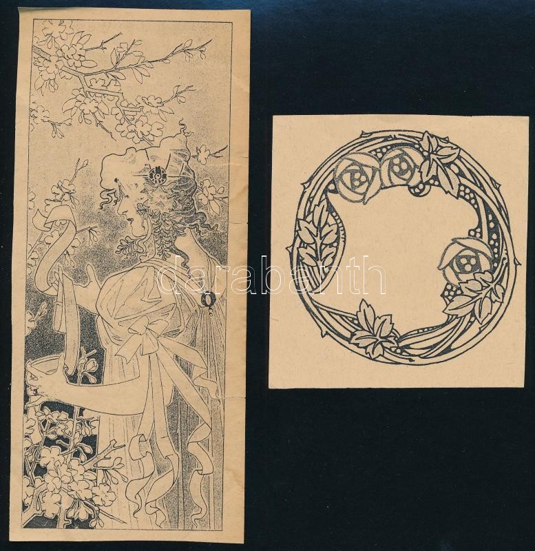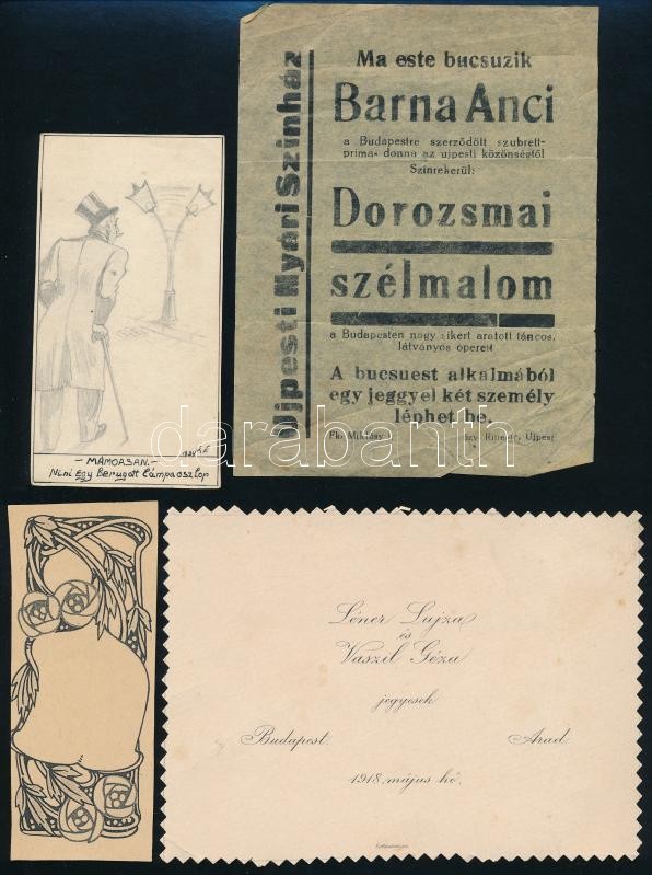 Description: cca 1900-1935 Kis papírrégiség tétel: esküvői meghívó, jelzett grafika, Újpesti Nyári Színház röplap, 3 db szecessziós ornamentika / számolócédula. Vegyes állapotban.
