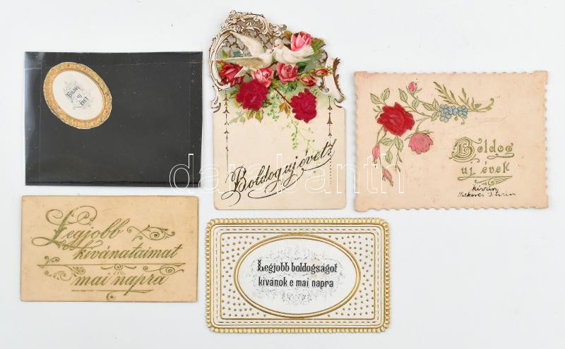 cca 1900 Újévi díszes üdvözlőkártya, 5 db, közte litho