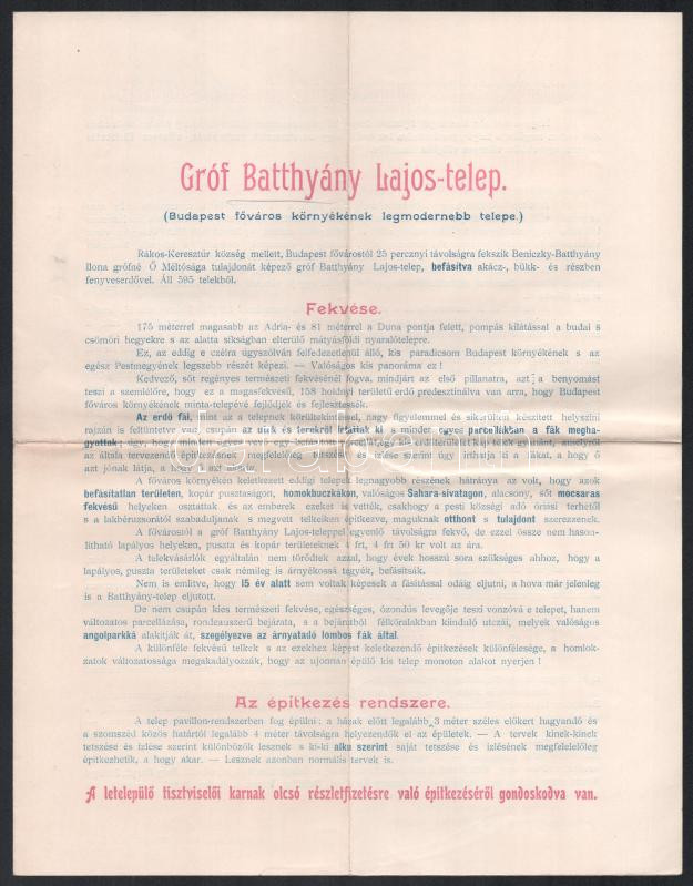 cca 1925 A Rákoskeresztúr község melletti Gróf Batthyány Lajos-telep kétlapos ismertetője és parcellázási terve, hajtva, szép állapotban