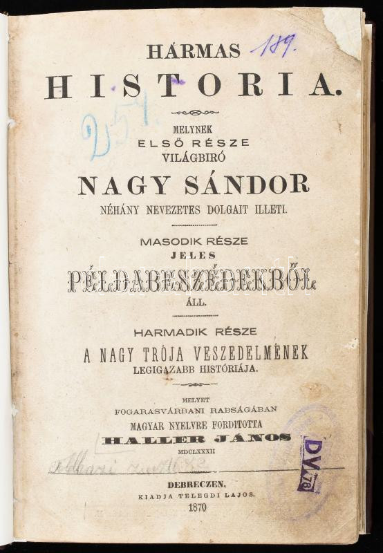 Description: Haller János: Hármas história. Hármas história. Melynek első része világbiró Nagy Sándor néhány nevezetes dolgait illeti. Második része jeles példabeszédekből áll. Harmadik része a nagy Trója veszedelmének legigazabb históriája. Debreczen, 1870. Telegdi. 425 + 6 l. Igényes modern bordázott félbőr kötésben