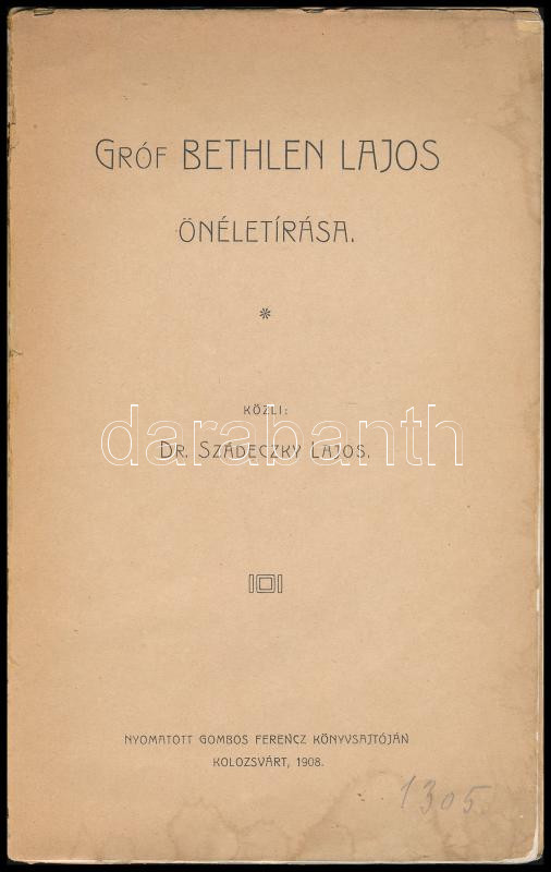 Description: Gróf Bethlen Lajos önéletírása. Bevezetéssel és jegyzetekkel közli: Dr. Szádeczky Lajos. Az író két képével. (Különnyomat az "Ujság" 1908. évi januári számaiból). Kolozsvár, 1908, Gombos Ferencz-ny., 126 p. + 2 t. Kiadói papírkötés, kissé sérült borítóval, helyenként kissé foltos, kissé sérült lapszélekkel.