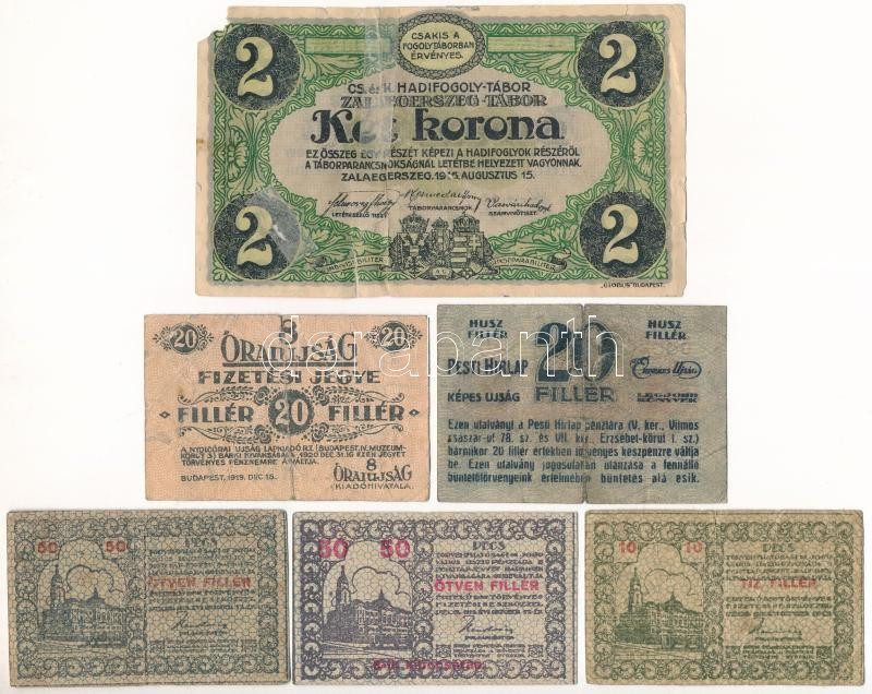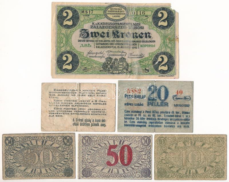 1916-1920. 6db-os vegyes magyar szükségpénztétel, közte Zalaegerszeg / hadifogolytábor 1916. augusztus 15. 1K arab sorozat és sorszámmal, "MS" jelzéssel (ragasztott, anyaghiány) + 1920. 20f "8 Órai Újság" + 1920. 20f "Pesti Hírlap" + Pécs 1919. 10f + 50f + 50f T:III-IV