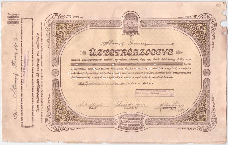 Description: Budakalász 1914. "Budakalászi hitelszövetkezet, mint az Országos központi hitelszövetkezet tagja" névre szóló üzletrészjegye 50K-ról, szelvényekkel, bélyegzéssel T:III papírhiány