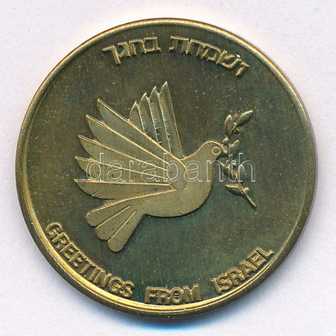 Description: Izrael 1987. "Üdvözlet Izraelből" kétoldalas Cu emlékérem "Üdvözlet Jeruzsálem-Izraelből" héber és angol nyelvű üdvözlőkártyával (25mm) T:1- ü.