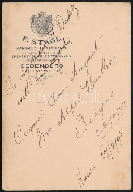 Description: cca 1895 Bohóc portréja, keményhátú fotó Stagl soproni műterméből, hátoldalán korabeli datált ajándékozási sorokkal és a bohóc nevével feliratozott, kissé foltos, 16x11 cm / Portrait of a clown, vintage photo from