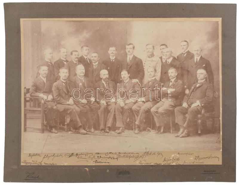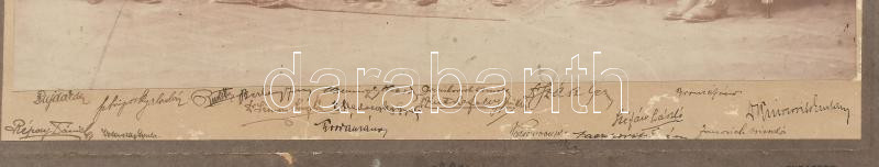 cca 1910-20 Férfiak csoportképe autográf aláírásaikkal, köztük egy katona valamint Volenszky Gyula, állami polgári iskolai tanár, tankönyvek szerzője; Sztripszky Aladár, a Nemzeti Kisebbségek Minisztériuma Rutén főosztályának számvevőségi tanácsosa; Répay Dániel, m. kir. állami tanítóképző-intézeti tanár (Pápa, majd Kolozsvár) többségében beazonosítandó aláírásokkal, vintage fotó kartonon, Kossak budapesti műterméből, 28x38 cm